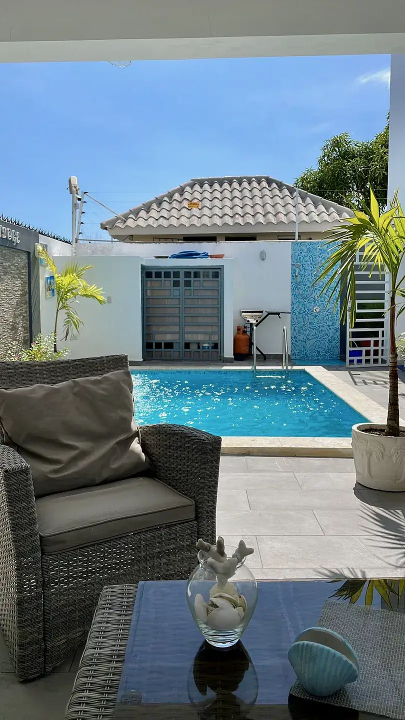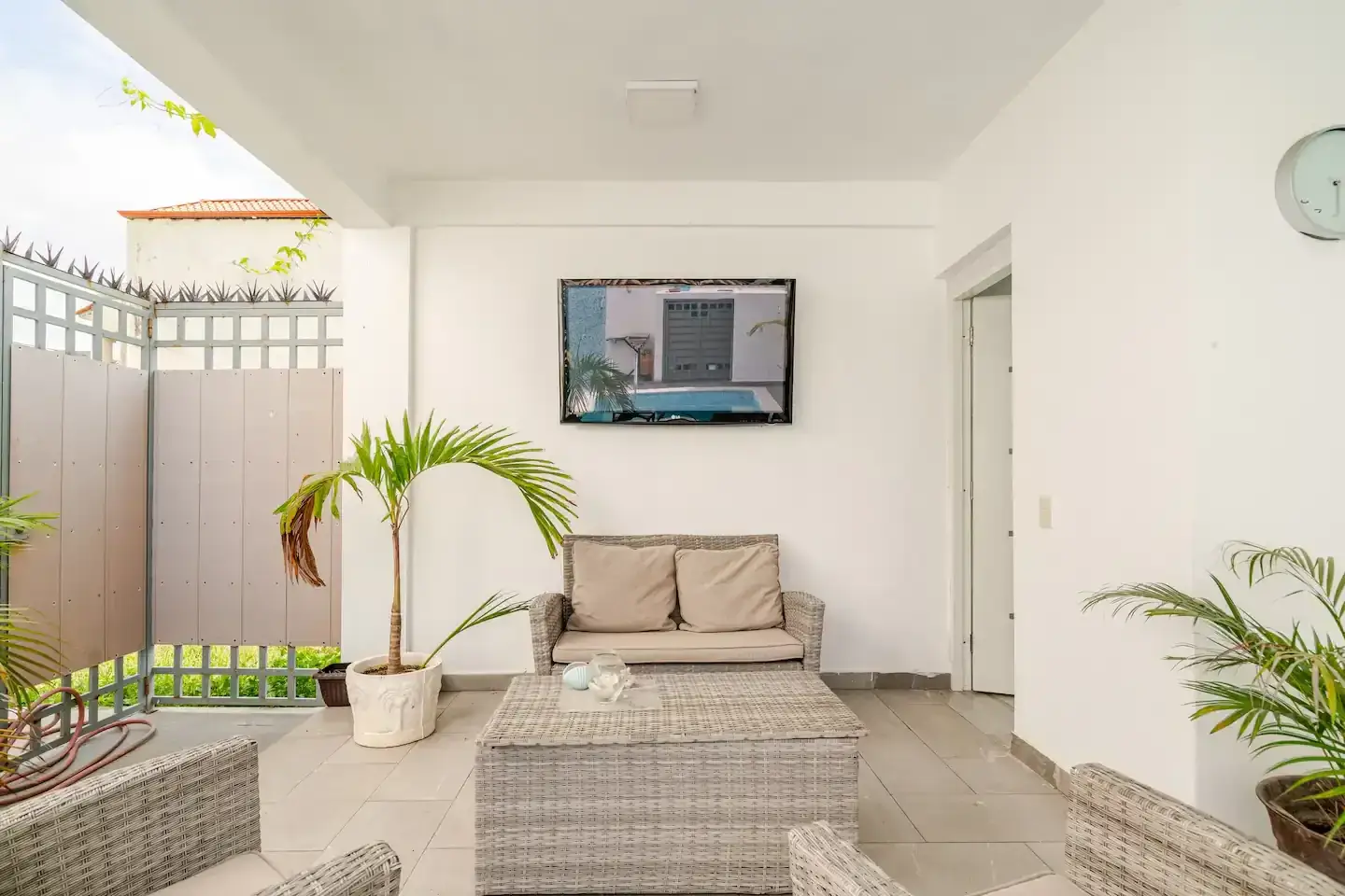 Patio a bordo piscina con TV e Area Barbecue: un’area attrezzata per cene all’aperto, barbecue e momenti di relax all’ombra delle palme.
